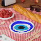 PAPER PLATES (Partido): Talisman & Amulet de olho Mau para proteção contra a negatividade e o bringer de boa sorte. Tradicionalmente originário de tribos árabes, turcas, gregas e protege-o de qualquer má vontade que, de outra forma, poderia ter um efeito negativo no seu bem-estar ou na sua vida em geral. A lenda da "maldição" dos olhos de mau, que se acredita ser lançada por um brilho maléfico, geralmente dá a uma pessoa, quando ela desconhece.