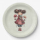 Pratos de papel com uma imagem retrô fofa apresentando uma menina caprichosa com bochechas rosadas e flores no cabelo. Carregando uma boneca de sapo verde.