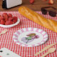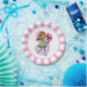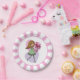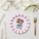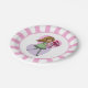 Pratos divertidos rosa e branco para festas com uma menina caprichosa e fofa com longos cabelos amarelos ondulados e vestindo um vestido verde e meias listradas. Ela está segurando um lindo buquê de rosas vermelhas com os braços estendidos. O fundo é composto por um coração de amor rosa e roxo.