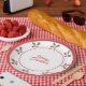 Merry Christmas paper plate in white and red tones with a hand drawn holly decoration