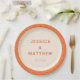 This personalized paper plate features a bold mid century modern geometric pattern in warm orange, pink, and yellow wrapping the rim, with the couple's names and wedding date centered on a cream background. The mod tile border brings a retro, vibrant energy that makes even the tableware feel intentional and design-forward. Customize with any names and date for a cohesive, eye-catching reception table. A perfect fit for a boho, maximalist, or vintage-inspired wedding celebration.