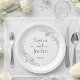 The center of the plate showcases the names of the couple in a sophisticated mix of classic serif and flowing handwritten script. Your wedding date is featured below in a crisp, contemporary font. With its timeless black and white monochrome palette, this tableware seamlessly complements any wedding theme, from a chic urban loft to an intimate garden ceremony. These high-quality plates offer a practical yet beautiful way to maintain a cohesive design across your dessert table or appetizer station.