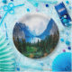 Placas de papel com uma bela fotografia de uma cena agradável e tranquila da natureza. Floresta verde vibrante na frente e montanhas azuis sombrias nas costas. Com um céu branco nublado e sonhador. Mistura e mágica.