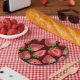 Morangos e fatias são pintados com aquarelas e o padrão é feito no Illustrator.