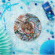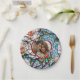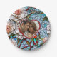 Placas de papel personalizadas para janto de ensaio ou de bolos de recepção de casamento com noiva e iniciais de noiva, data de casamento e fotografia. . Uma ilustração magnífica imitando um vidro colorido e um mosaico de azulejos de coral, com sotaques azuis e coloridos.
