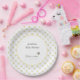 Baby shower paper plate or bowl personalized with a "mother-to-bee" theme. It's designed with a simple pattern of daisy flowers on white with a cute little bee accent. Text is pre-formatted and ready for your own details. Coordinates with baby shower invitation and other items in this same collection.