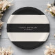Um clássico olhar para uma festa de aniversário ou outra celebração especial, este simples design tem um padrão de listras horizontais em preto e casca de ovo em branco. Um modelo de texto é incluído para personalizar com o nome do convidado de honra. Todo o texto pode ser personalizado para se adequar ao seu evento ou celebração. Essas placas de papel estão disponíveis em 2 tamanhos: mostrados aqui no tamanho de 7 pol, há também um tamanho de 9 pol disponível.
