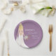 Este prato de papel temático boho apresenta uma cortina graciosa de pérolas e uma deslumbrante noiva boho com cabelo loiro em um delicado vestido de noiva de renda. Adornado com um exuberante buquê de rosas, grama pampas, eucalipto e ranunculus.