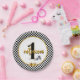 O Urban Retro 90's Hip Hop primeiro aniversario Vibe! apresenta texto cursivo de tag centrado {não alterável} retrorado preto e branco com um fundo padronizado de tabuleiro com tênis de bebê correspondentes e coroa dourada. Cor preta, branca e dourada. ©2021 Designs do Partido Sassy