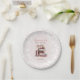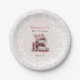 Esta doce placa de papel floral é para um evento de chá de fraldas, com o tema 'Novo capítulo'. Apresenta ilustrações de uma pilha de aquarelas de livros decorados florais e o fundo é de peônias cor-de-rosa claro e claro, de cor suave. Tipo de letra clássico do estilo inglês para uma sensação de livros de ilustração de crianças antigas.