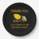 Batedor de cimento amarelo e preto, pratos de papel "obrigado você", festa de aniversário de criança. Texto diz, "Obrigado por vir à minha festa de aniversário"