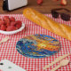 A paper plates with an illustration of a stained glass mosaic ocean waves and sunset illustration. These are perfect for a beach themed coastal birthday party.
