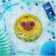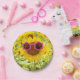Óculos de sol cor-de-rosa sobre girassol num campo de girassol.