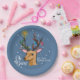 Este é um desenho de um veado que parece chateado porque suas galhadas estão enfiadas como uma árvore de Natal. Há até uma estrela brilhante no topo. Ele está dizendo "Oh veado, é aquela estação de novo..." Você também pode ver neve ao fundo.