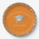 This modern design features a graduation hat and confetti in silver on a background of Orange with white text.