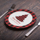 Esta design apresenta um belo guião natalício de caligrafia, uma bela placa de papel com um simples cheque de búfalos de árvore de Natal, um texto de caligrafia de na moda, uma casa de campo rústica mínima, um padrão de férias festivas minimalista, design branco e preto vermelho, material de festas para o aperitivo para o almoço, um estilo criativo e simplista de cheques de Natal, um produto de papelão descartável