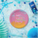 O tema da boneca "Bach Party" rosa é uma adição divertida para uma festa de solteira com a noiva que será o nome acima em uma fonte de script e data abaixo. O fundo é colorido com o céu azul e amarelo inspirado numa praia da Califórnia.