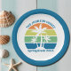 Estas placas de papel personalizadas e legal da praia tropical do pôr do sol apresentam 3 palmeiras silhuetadas contra um céu laranja e azul acentuadas com amarelo e verde na costa. Personalize com seu nome de viagem familiar para sua fuga costeira nas férias de primavera ou de verão ou cruzeiro oceânico.