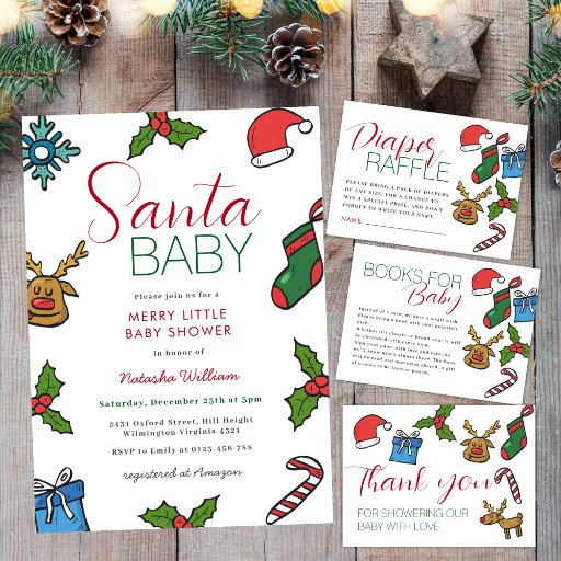 O design apresenta um chá de fraldas temático "Papais noeis Bebê" com ilustrações bonitinhas de chapéu de Papai Noel, cana-de-açúcar, caixa de presentes e meias de Natal. Perfeito para um chá de fraldas de Natal. Se precisar de ajuda para a personalização do produto ou se precisar de produtos correspondentes, por favor contacte-me através do Zazzle.