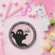 Este prato de papel assombrado de Halloween antigo apresenta um design de damasco rosa vitoriano com listras pretas e rosas em torno da borda. Há uma grande silhueta de Fantasma com texto que diz "Eu faço Boo."