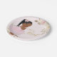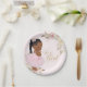 Tigelas de papel para chá de bebê de bailarina rosa e dourada com adorável bebê africana vestindo um lindo tutu de princesa rosa com tranças e laço no cabelo sobre um lindo fundo floral rosa e dourado. Esses pratos de papel para chá de bebê rosa e dourado são facilmente personalizados para o seu evento simplesmente adicionando os detalhes do evento. Você pode alterar a cor do fundo.
