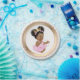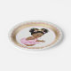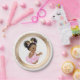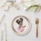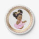 Pratos de papel cor-de-rosa e dourado para chá de bebê com adorável menina afro-americana em um belo fundo cor-de-rosa e dourado. Estes adoráveis pratos de papel para chá de bebê de menina étnica são facilmente personalizados com texto e você também pode alterar a cor do fundo.