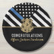 Uma forma excelente de dizer parabéns aos novos reformados ou formandos para sua aposentadoria ou graduação na academia de polícia. Este design apresenta uma bandeira da polícia com listras pretas e brancas, e uma fina faixa azul de linha também. Personalize com o nome do oficial de polícias, xerife, capitão ou chefe. Celebre este marco em estilo!