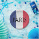Ilustração de design de texto de Paris com decoração em Torre Eiffel sobre fundo de bandeira francesa de moagem