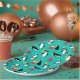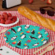 Parte da coleção do partido do pinguim, pinguins do divertimento que comemoram uma festa de aniversário, fundo de turquesa.