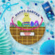 Dois cestos de Páscoa castanho-tônico com ovos decorados em grama de Páscoa rosa e verde e manípulo rosa. Tipografia do felz pascoa em azul profundo. Pintinho amarelo-claro eclodido a partir de ovos listrados coloridos em vermelho, amarelo, azul, verde e roxo. Tipografia do nome da família em retângulo branco e preto-e-dentro vermelho. Design de arte original © TamiraZDesign.