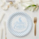 Prato de papel para festa é mostrado em uma linda estampa Páscoa xadrez azul e branco.