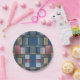 "Denim Patchwork" Um arranjo simétrico de retângulos texturizados, semelhantes a tecido, em tons mutados de azul, verde, rosa e bege. O layout se assemelha a uma manta de retalhos ou mosaico, com cada bloco meticulosamente alinhado para criar uma estrutura equilibrada, em forma de grade.