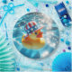 Pato de borracha amarelo decorado com bandeira americana que flutua sobre água espumante de piscina de natação
