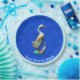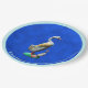 Perfeito para uma festa de jardim. Pato de madeira pintado e esculpido com seu patinho, fortemente curado, sobre fundo azul. Adicione seu próprio texto.
