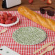 Pattern of green leafy branches on a white background, creating a dense, repeating design. The tone is fresh and nature-inspired.