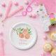 Estas pratos de papel de aniversário bonitinhos apresentam pêssegos pintados manualmente com aquarelas, flores de pêssego e folhas vibrantes.