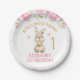 Um coelho bonito está virando uma placa de papel de aniversário com tema, com um coelho peludo, arranjos florais cor-de-rosa, duas borboletas, alguns pontos e um número falso de ouro amovível. Este prato de aniversário do coelho temido é uma maneira doce de convidar convidados para uma próxima festa de aniversário temática de coelhinho para uma garotinha.