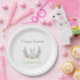 Complete your Easter table setting with these matching personalized paper plates. Featuring a delicate watercolor white bunny and spring floral wreath, they are the perfect addition to your holiday brunch or dinner. Custom with your family name for a special touch.