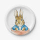Peter, o coelho na sua jaqueta azul sentado num pote de terracota.