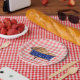 Placas de papel com torta de mirtilo sendo levada por uma formiga. Parte da Coleção de Piquenique de Verão.