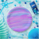 Apresenta um design pintado de cor rosa, roxo e turquesa.