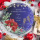 Placas de papel personalizadas com um tema de casamento de Natal! Fácil de atualizar e tão bonito com um fundo azul de gradiente ousado, flocos de neve, e uma adorável poinsettia vermelha entre vergreens e duas flautas de champanhe.