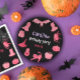 Placa de papel de Festa de aniversário rosa, roxa e preta, com motivos ilustrados de Halloween. Personalize o nome, a data e outro texto conforme desejar.