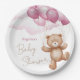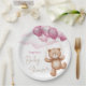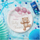 Placa de papel chá de fraldas decorada com um adorável ursinho de pelúcia cavalgando balões nas nuvens.
