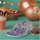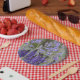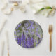 Esta placa de papel apresenta flores roxas. Excelente para festas, piqueniques, chás, casamentos