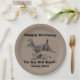 Placa dos cervos do feliz aniversario - o feliz aniversario a um fanfarrão velho adiciona o nome para a personalização final. Imagem de um fanfarrão que salta através das madeiras