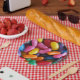 Placas de papel que caracterizam uma foto de feijões de geléia.