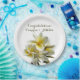 Placas de chá de casamento ou de papel de festa de noivado. As placas redondas têm uma linha de texto para nomes e/ou parabéns. As placas amarelas claras têm uma grande imagem floral. Frangipani branco, ou plumeria, as flores têm centros amarelos ouros combinados com botões, neste design floral realista bonito. Use para um chá de casamento, janto de ensaio ou festa de noivado casual.