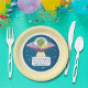 Personalize estas placas de papel adoráveis para o seu próximo chá de fraldas! Um bebê alienígena fofo senta-se na sua nave espacial no centro do prato!