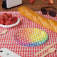 Travesseiro arco-íris com um padrão de ponto. Você pode alterar a imagem de fundo para uma aparência diferente.